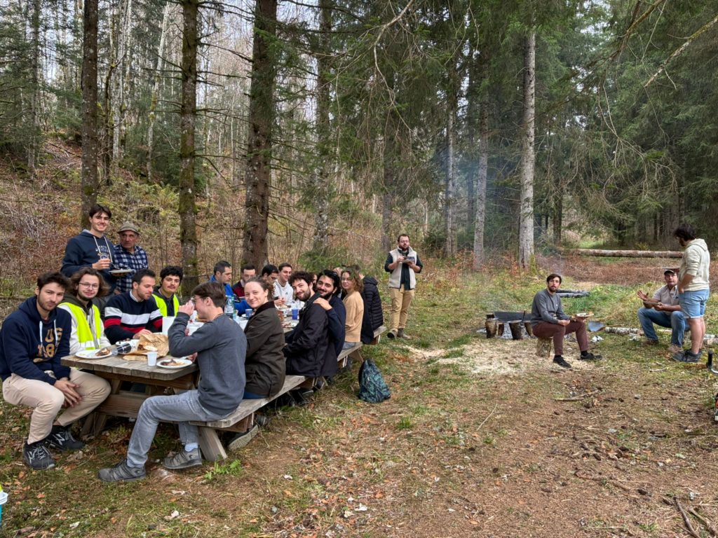 Ce cadre grandiose, offrant une vue imprenable, a permis aux étudiants d’échanger avec l’un de nos bûcherons, véritable passionné de son métier et de ce territoire. Autour des flammes, ils ont pu déguster des produits et mets locaux, associant pleinement la découverte des savoir-faire à la richesse du terroir de l’Ain, dans une ambiance unique de parrainage.